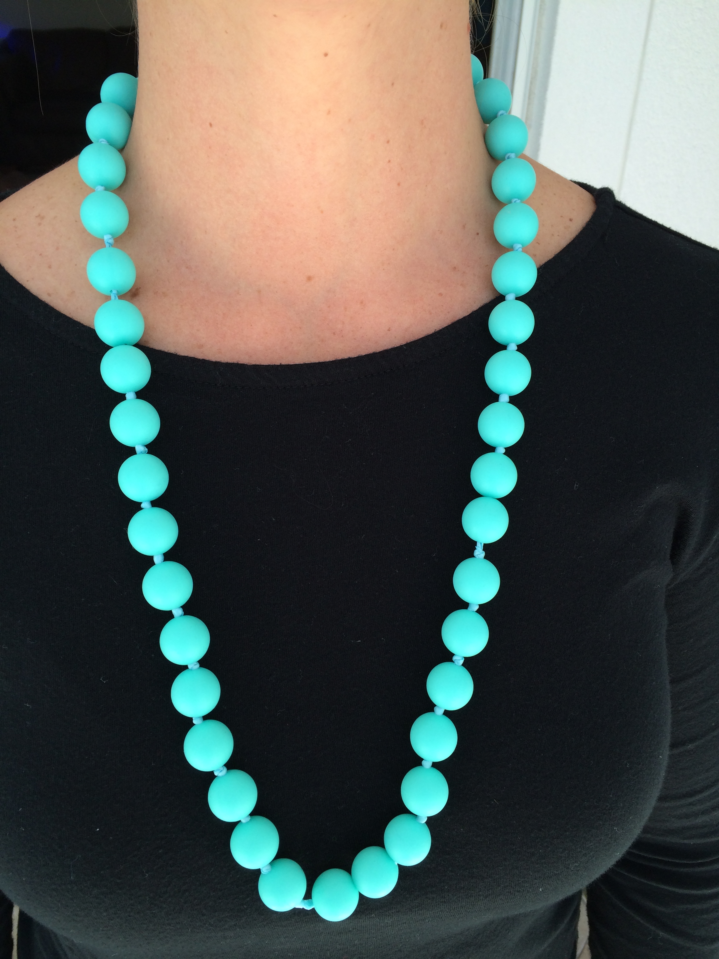 I foresee what your concerns are going to be. 1) Will my child then start chewing on all my necklaces? I have not had that problem. My little guy is able to distinguish between the rubberiness of this necklace versus a traditional necklace, and hasn’t tried to chew on other necklaces, pull yes, but not put in his mouth. 2) Will people know that my necklace is actually a teether for my child? Absolutely not! I have gotten tons of compliments on my necklace from unsuspecting people.