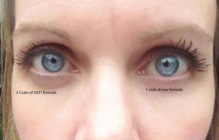 My model has regular mascara on the left side and one coat of the old formula on the right side. When I use a demo mascara with disposable wands you don’t get the full results, but you can definitely see the difference!